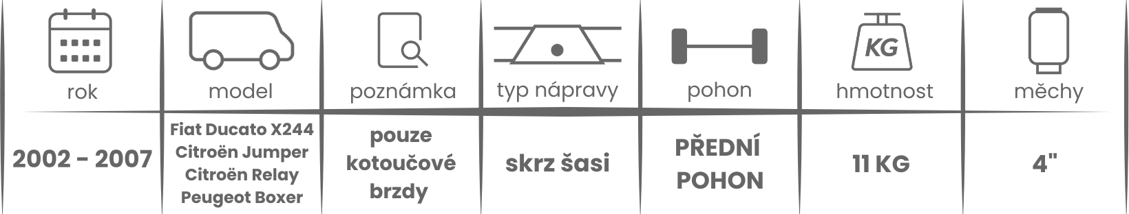 Přídavné měchy DUNLOP pro podvozky AL-KO Fiat Ducato X244, Citroen Jumper, Citroen Relay a Peugeot Boxer (2002 - 2007) s kotoučovými brzdami jsou nabízeny v několika verzích a možnostech, pro tento typ vzduchového pérování jsou možné varianty s kompresorem níže (k vhodnému vybrání vzduchového pérování DUNLOP pro Vaše vozidlo s podvozkem AL-KO může posloužit také návod ZDE, určovací tabulka níže, nebo ke stažení v příloze).