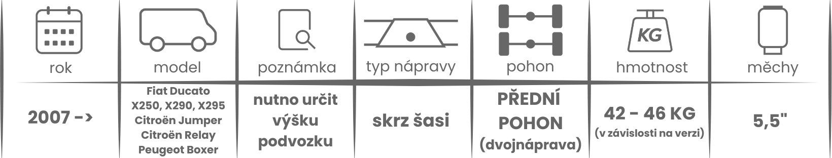 Přídavné měchy DUNLOP pro podvozky AL-KO Fiat Ducato X250/X290/X295, Citroen Jumper, Citroen Relay a Peugeot Boxer (2007 -) se zesílenou dvojnápravou jsou nabízeny v několika verzích a možnostech, pro tento typ vzduchového pérování jsou možné varianty s kompresorem níže (k vhodnému vybrání vzduchového pérování DUNLOP pro Vaše vozidlo s podvozkem AL-KO může posloužit také návod ZDE, určovací tabulka níže, nebo ke stažení v příloze).