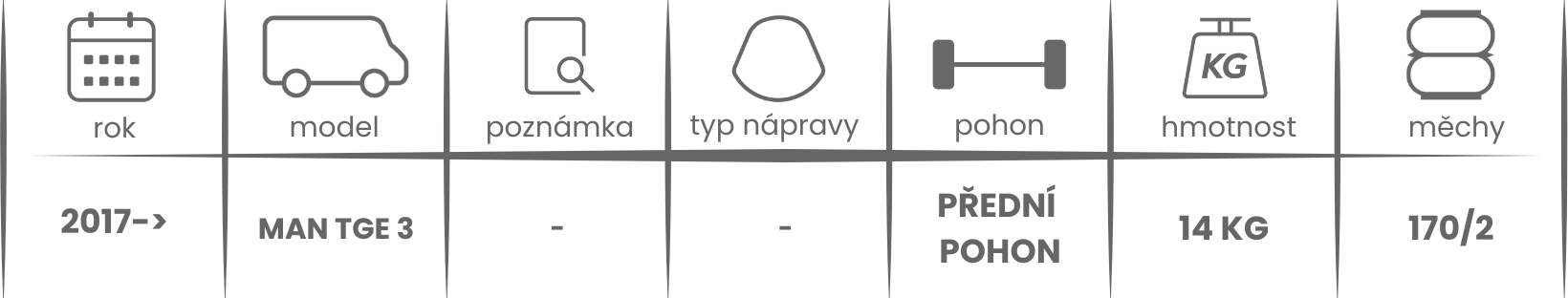 Přídavné měchy DUNLOP pro MAN TGE přední náhon (2017-) jsou nabízeny v několika verzích a možnostech, pro tento typ vzduchového pérování jsou možné varianty níže (k vhodnému vybrání vzduchového pérování Dunlop pro Vaše vozidlo může posloužit také návod ZDE).