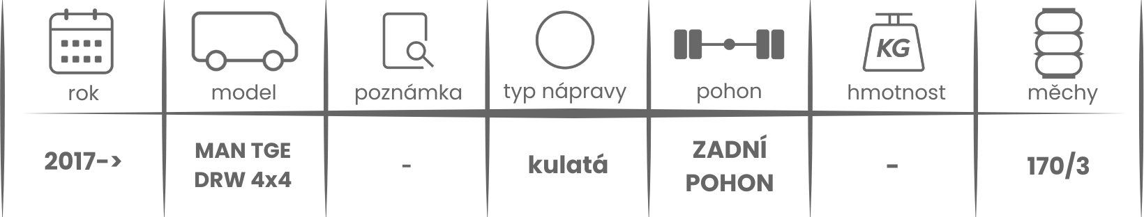 Přídavné měchy DUNLOP pro MAN TGE 4x4, dvojmontáž (2017-) jsou nabízeny v několika verzích a možnostech, pro tento typ vzduchového pérování jsou možné varianty níže (k vhodnému vybrání vzduchového pérování Dunlop pro Vaše vozidlo může posloužit také návod ZDE).