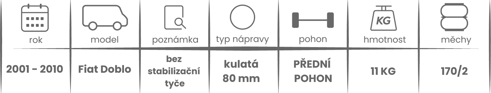 Přídavné měchy DUNLOP pro Fiat Doblo 2001-2010 jsou nabízeny v několika verzích a možnostech, pro tento typ vzduchového pérování jsou možné varianty níže (k vhodnému vybrání vzduchového pérování Dunlop pro Vaše vozidlo může posloužit také návod ZDE).