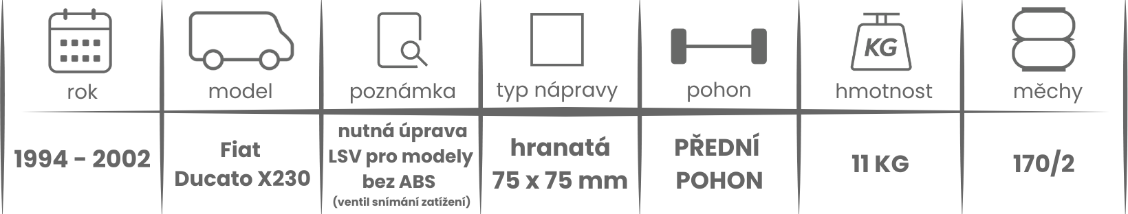 Přídavné měchy DUNLOP pro Fiat Ducato X230 jsou nabízeny v několika verzích a možnostech, pro tento typ vzduchového pérování jsou možné varianty níže (k vhodnému vybrání vzduchového pérování Dunlop pro Vaše vozidlo může posloužit také návod ZDE).