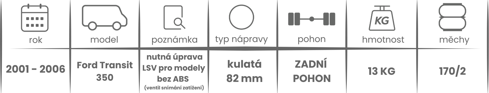 Vzduchové pérování pro Ford Transit 350 s bubnovými brzdami, dvojmontáží a zadním pohonem.