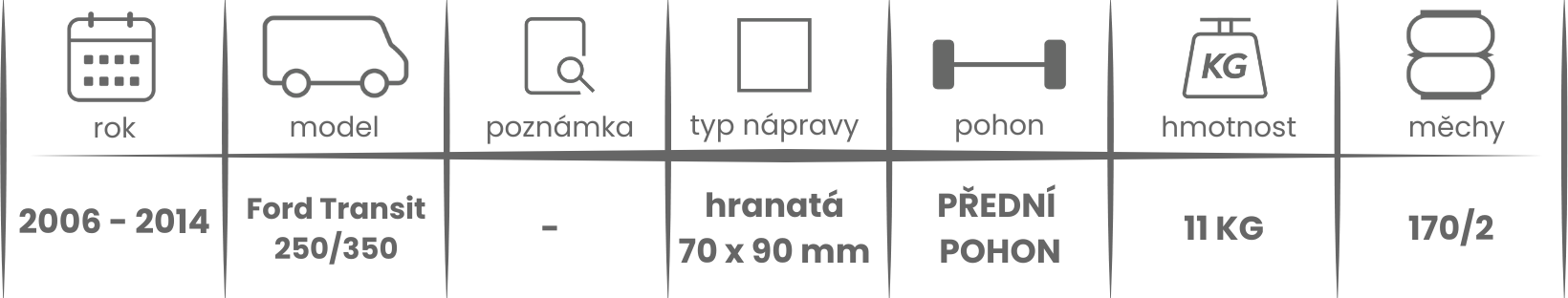 Přídavné měchy DUNLOP pro Ford Transit 250/350 s kotoučovými brzdami, předním pohonem a jednomontáží jsou nabízeny v několika verzích a možnostech, pro tento typ vzduchového pérování jsou možné varianty níže (k vhodnému vybrání vzduchového pérování Dunlop pro Vaše vozidlo může posloužit také návod ZDE).