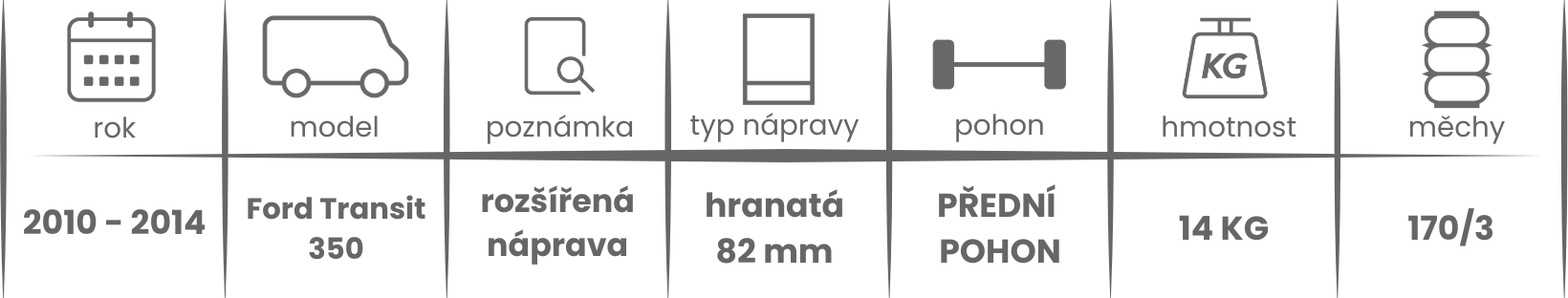 Přídavné měchy DUNLOP pro Ford Transit 350 s předním pohonem, kotoučovými brzdami a rozšířeným podvozkem (2010 - 2014) jsou nabízeny v několika verzích a možnostech, pro tento typ vzduchového pérování jsou možné varianty níže (k vhodnému vybrání vzduchového pérování Dunlop pro Vaše vozidlo může posloužit také návod ZDE).
