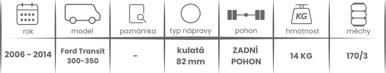 Přídavné měchy DUNLOP pro Ford Transit 300-350 se zadním pohonem, dvojmontáží a kotoučovými brzdami (2006 - 2014) jsou nabízeny v několika verzích a možnostech, pro tento typ vzduchového pérování jsou možné varianty níže (k vhodnému vybrání vzduchového pérování Dunlop pro Vaše vozidlo může posloužit také návod ZDE).