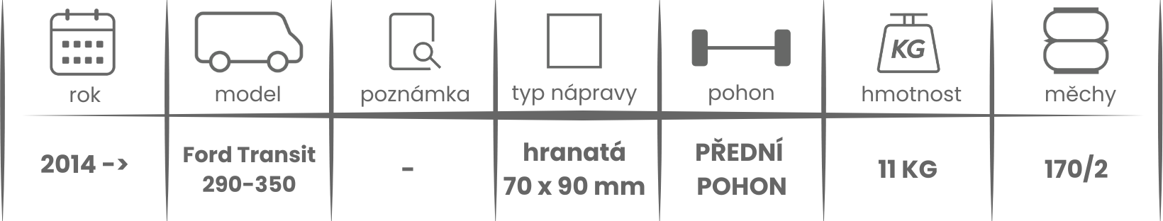 Přídavné měchy DUNLOP pro Ford Transit 290/350 s předním pohonem, jednomontáží a s nižšími dorazy (2014 -) jsou nabízeny v několika verzích a možnostech, pro tento typ vzduchového pérování jsou možné varianty níže (k vhodnému vybrání vzduchového pérování Dunlop pro Vaše vozidlo může posloužit také návod ZDE).