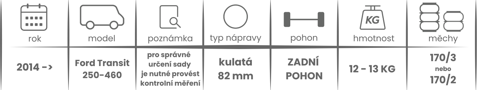 Přídavné měchy DUNLOP pro Ford Transit 250/460 se zadním pohonem a jednomontáží (2014 -) jsou nabízeny v několika verzích a možnostech, pro tento typ vzduchového pérování jsou možné varianty níže (k vhodnému vybrání vzduchového pérování Dunlop pro Vaše vozidlo může posloužit také návod ZDE).
