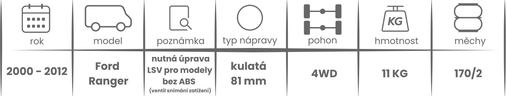 Přídavné měchy DUNLOP pro Ford Ranger 4WD (2000 - 2012) jsou nabízeny v několika verzích a možnostech, pro tento typ vzduchového pérování jsou možné varianty níže (k vhodnému vybrání vzduchového pérování Dunlop pro Vaše vozidlo může posloužit také návod ZDE).