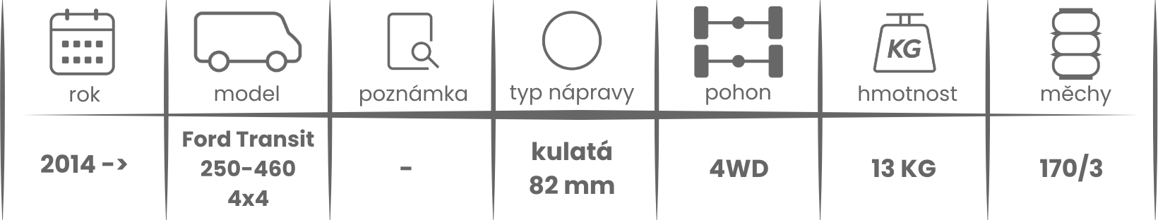 Přídavné měchy DUNLOP pro Ford Transit 250/460 s pohonem 4WD a jednomontáží. (2014 -) jsou nabízeny v několika verzích a možnostech, pro tento typ vzduchového pérování jsou možné varianty níže (k vhodnému vybrání vzduchového pérování Dunlop pro Vaše vozidlo může posloužit také návod ZDE).