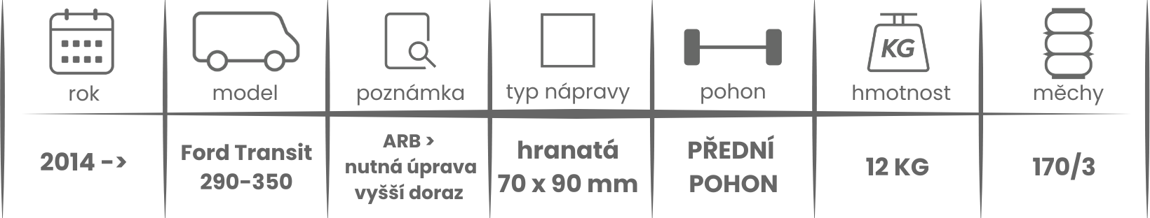 Přídavné měchy DUNLOP pro Ford Transit 290/350 s předním pohonem, jednomontáží a s vyššími dorazy (2014 -) jsou nabízeny v několika verzích a možnostech, pro tento typ vzduchového pérování jsou možné varianty níže (k vhodnému vybrání vzduchového pérování Dunlop pro Vaše vozidlo může posloužit také návod ZDE).