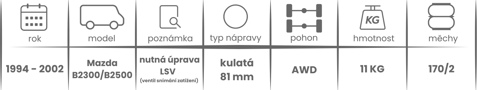 Přídavné měchy DUNLOP pro Mazda B2300/B2500 (1994-2002) jsou nabízeny v několika verzích a možnostech, pro tento typ vzduchového pérování jsou možné varianty níže (k vhodnému vybrání vzduchového pérování Dunlop pro Vaše vozidlo může posloužit také návod ZDE).