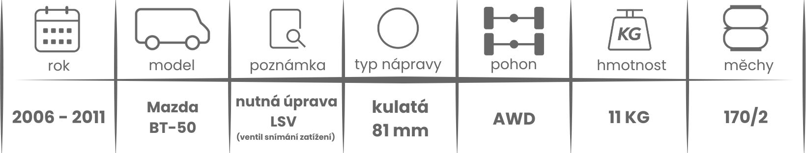Přídavné měchy DUNLOP pro Mazda BT50 (2006-2011) jsou nabízeny v několika verzích a možnostech, pro tento typ vzduchového pérování jsou možné varianty níže (k vhodnému vybrání vzduchového pérování Dunlop pro Vaše vozidlo může posloužit také návod ZDE).