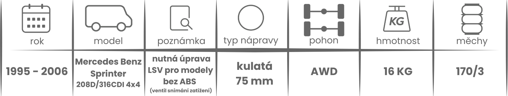 Přídavné měchy DUNLOP pro Mercedes Benz Sprinter 208D/316CDI (1995-2006) 4x4 bez ABS 902/903) jsou nabízeny v několika verzích a možnostech, pro tento typ vzduchového pérování jsou možné varianty níže (k vhodnému vybrání vzduchového pérování Dunlop pro Vaše vozidlo může posloužit také návod ZDE).