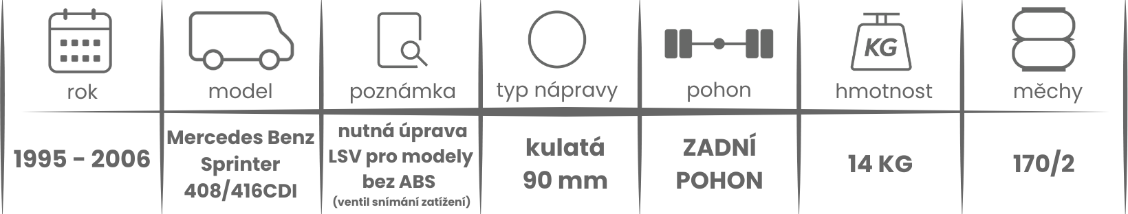 Přídavné měchy DUNLOP pro Mercedes Benz Sprinter 408D/416CDI (1995-2006) WDB 904 jsou nabízeny v několika verzích a možnostech, pro tento typ vzduchového pérování jsou možné varianty níže (k vhodnému vybrání vzduchového pérování Dunlop pro Vaše vozidlo může posloužit také návod ZDE).