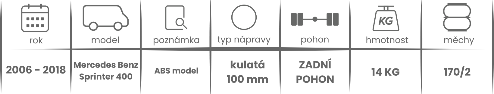 Přídavné měchy DUNLOP pro Mercedes Benz Sprinter 400 (2006-2018) WDB 906 jsou nabízeny v několika verzích a možnostech, pro tento typ vzduchového pérování jsou možné varianty níže (k vhodnému vybrání vzduchového pérování Dunlop pro Vaše vozidlo může posloužit také návod ZDE).
