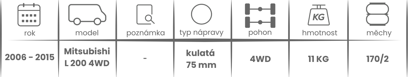 Přídavné měchy DUNLOP pro Mitsubishi L200 4WD (2006-2015) jsou nabízeny v několika verzích a možnostech, pro tento typ vzduchového pérování jsou možné varianty níže (k vhodnému vybrání vzduchového pérování Dunlop pro Vaše vozidlo může posloužit také návod ZDE).