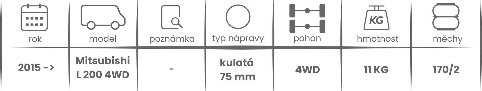 Přídavné měchy DUNLOP pro Mitsubishi L200 4WD (2015- ) jsou nabízeny v několika verzích a možnostech, pro tento typ vzduchového pérování jsou možné varianty níže (k vhodnému vybrání vzduchového pérování Dunlop pro Vaše vozidlo může posloužit také návod ZDE).