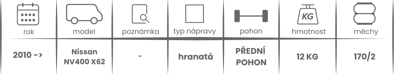 Přídavné měchy DUNLOP pro Nissan NV400 X62 (2010-), jednomontáž, přední pohon) - přídavné vzduchové pérování Dunlop jsou nabízeny v několika verzích a možnostech, pro tento typ vzduchového pérování jsou možné varianty níže (k vhodnému vybrání vzduchového pérování Dunlop pro Vaše vozidlo může posloužit také návod ZDE).