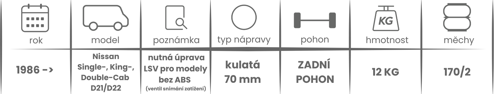 Přídavné měchy DUNLOP pro Nissan Single King (1986-) dvojitá kabina D21/D22, 2WD - přídavné vzduchové pérování Dunlop jsou nabízeny v několika verzích a možnostech, pro tento typ vzduchového pérování jsou možné varianty níže (k vhodnému vybrání vzduchového pérování Dunlop pro Vaše vozidlo může posloužit také návod ZDE).