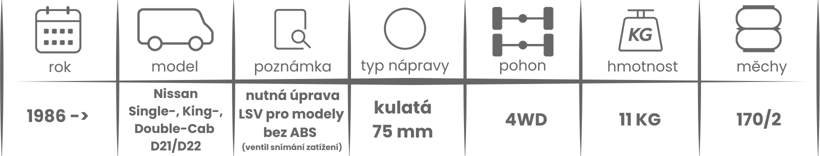 Přídavné měchy DUNLOP pro Nissan Single King (1986-) dvojitá kabina D21/D22, 4WD - přídavné vzduchové pérování Dunlop jsou nabízeny v několika verzích a možnostech, pro tento typ vzduchového pérování jsou možné varianty níže (k vhodnému vybrání vzduchového pérování Dunlop pro Vaše vozidlo může posloužit také návod ZDE).