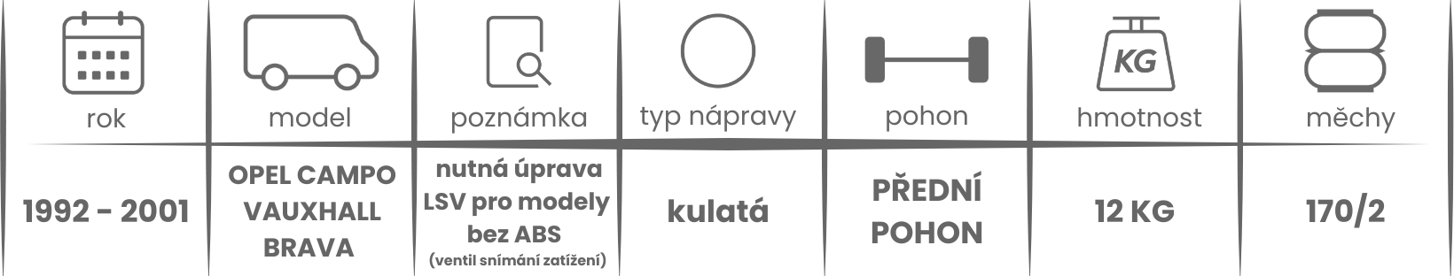 Přídavné měchy DUNLOP pro Opel Campo a Vauxhall Brava (1992 - 2001) jsou nabízeny v několika verzích a možnostech, pro tento typ vzduchového pérování jsou možné varianty níže (k vhodnému vybrání vzduchového pérování Dunlop pro Vaše vozidlo může posloužit také návod ZDE).