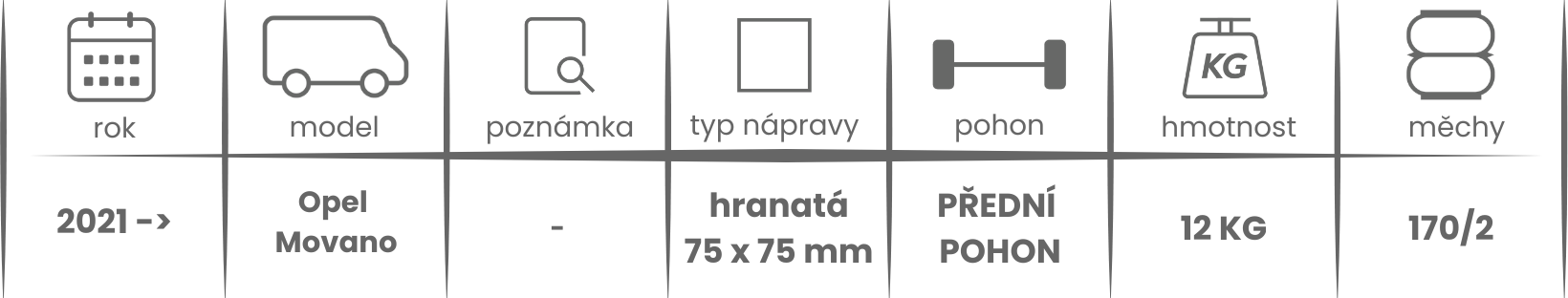 Přídavné měchy DUNLOP pro Opel Movano s předním pohonem a jednomontáží (rok 2021 ->) jsou nabízeny v několika verzích a možnostech, pro tento typ vzduchového pérování jsou možné varianty níže (k vhodnému vybrání vzduchového pérování Dunlop pro Vaše vozidlo může posloužit také návod ZDE).