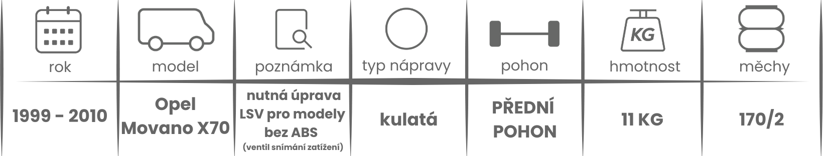 Přídavné měchy DUNLOP pro Opel Movano X70 jsou nabízeny v několika verzích a možnostech, pro tento typ vzduchového pérování jsou možné varianty níže (k vhodnému vybrání vzduchového pérování Dunlop pro Vaše vozidlo může posloužit také návod ZDE).