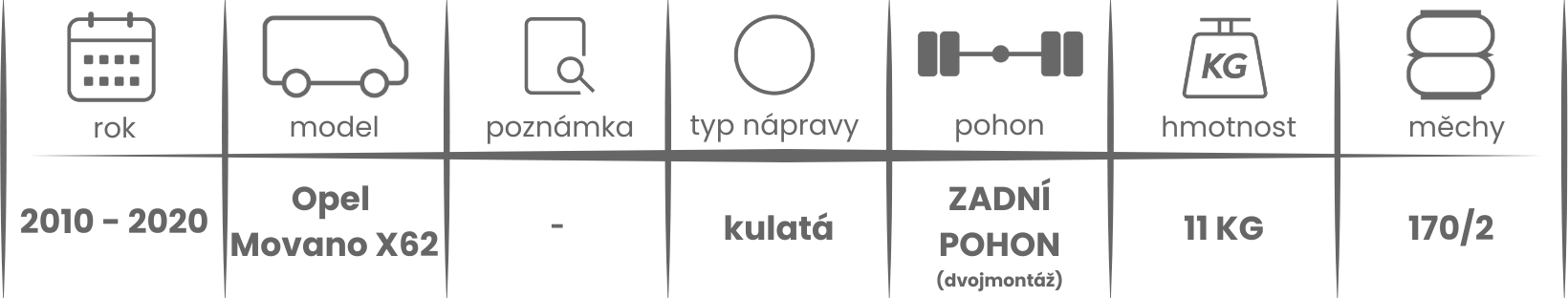 Přídavné měchy DUNLOP pro Opel Movano X62 se zadním pohonem a dvojomontáží jsou nabízeny v několika verzích a možnostech, pro tento typ vzduchového pérování jsou možné varianty níže (k vhodnému vybrání vzduchového pérování Dunlop pro Vaše vozidlo může posloužit také návod ZDE).