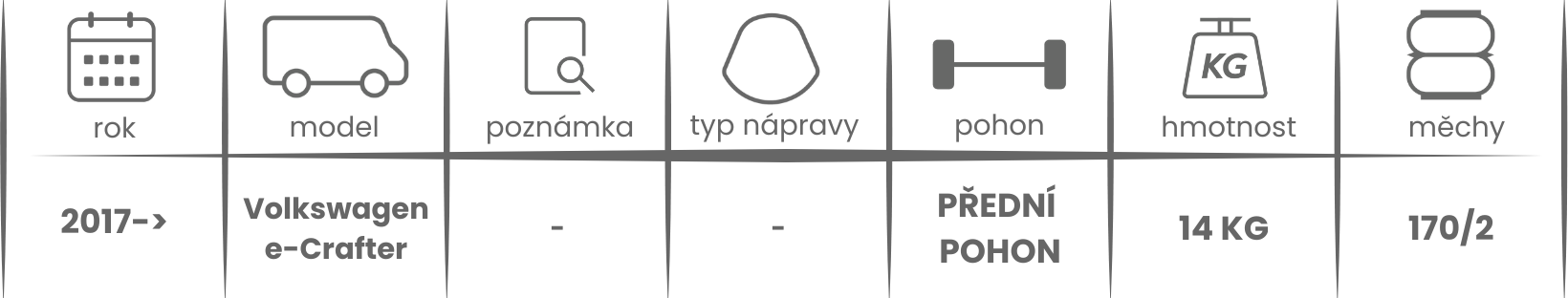 Přídavné měchy DUNLOP pro Volkswagen e-Crafter přední pohon ( 2017- ) jsou nabízeny v několika verzích a možnostech, pro tento typ vzduchového pérování jsou možné varianty níže (k vhodnému vybrání vzduchového pérování Dunlop pro Vaše vozidlo může posloužit také návod ZDE).