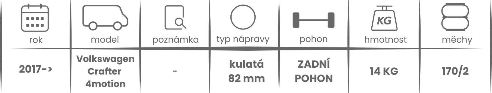 Přídavné měchy DUNLOP pro Volkswagen Crafter 4MOTION ( 2017- ) jsou nabízeny v několika verzích a možnostech, pro tento typ vzduchového pérování jsou možné varianty níže (k vhodnému vybrání vzduchového pérování Dunlop pro Vaše vozidlo může posloužit také návod ZDE).