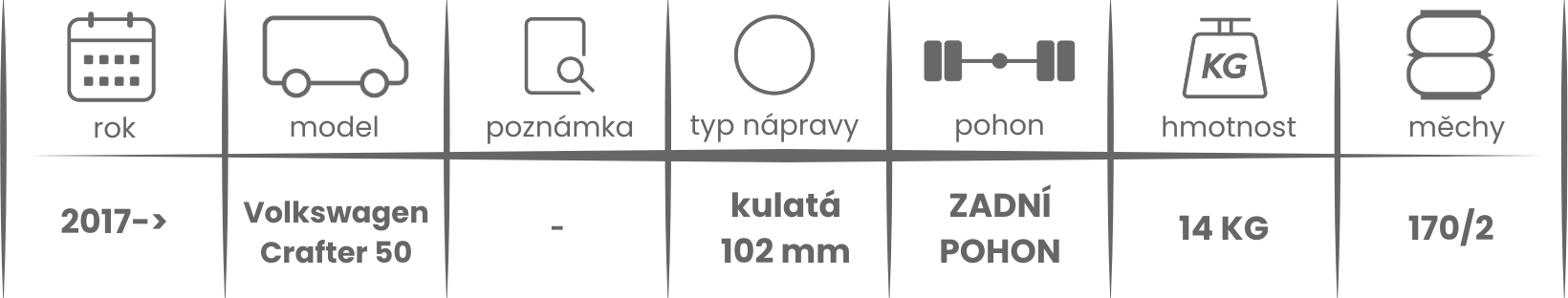 Přídavné měchy DUNLOP pro Volkswagen Crafter 50 DRW zadní pohon (2017-) jsou nabízeny v několika verzích a možnostech, pro tento typ vzduchového pérování jsou možné varianty níže (k vhodnému vybrání vzduchového pérování Dunlop pro Vaše vozidlo může posloužit také návod ZDE).