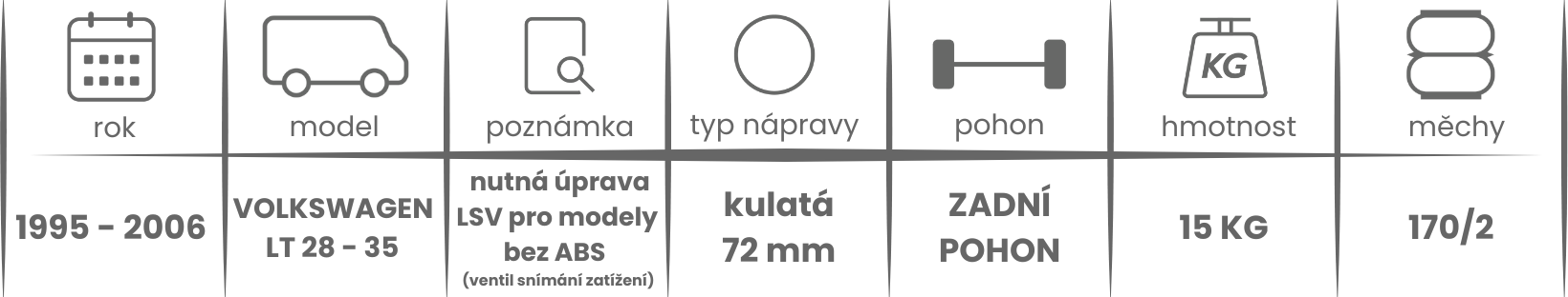 Přídavné měchy DUNLOP pro Volkswagen LT 28-35 (1995-2006) jsou nabízeny v několika verzích a možnostech, pro tento typ vzduchového pérování jsou možné varianty níže (k vhodnému vybrání vzduchového pérování Dunlop pro Vaše vozidlo může posloužit také návod ZDE).